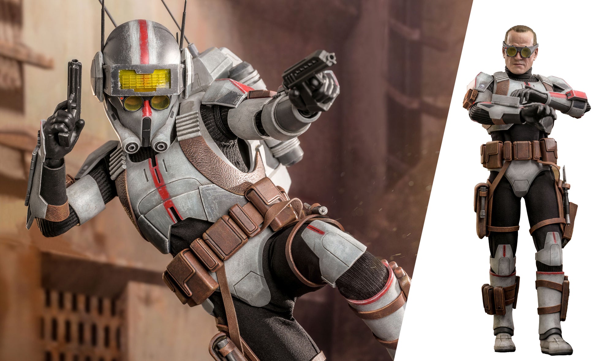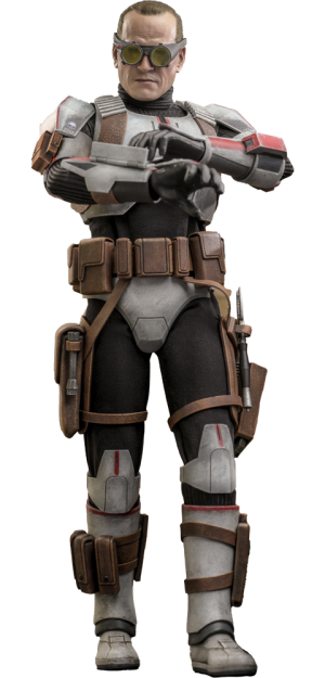 The Tech Sixth Scale Figure features the character's unique armor and helmet with weathering effects, an interchangeable head sculpt with realistic likeness, a pair of goggles, a wearable helmet, a pair of blaster pistols, a selection of tools, a backpack, and a display base!