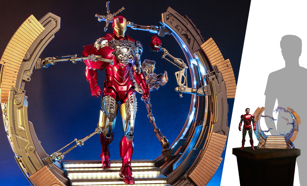 This Iron Man Mark VI with Suit-Up Gantry Sixth Scale Collectible Set will be an iconic piece for your Marvel action figure collection!