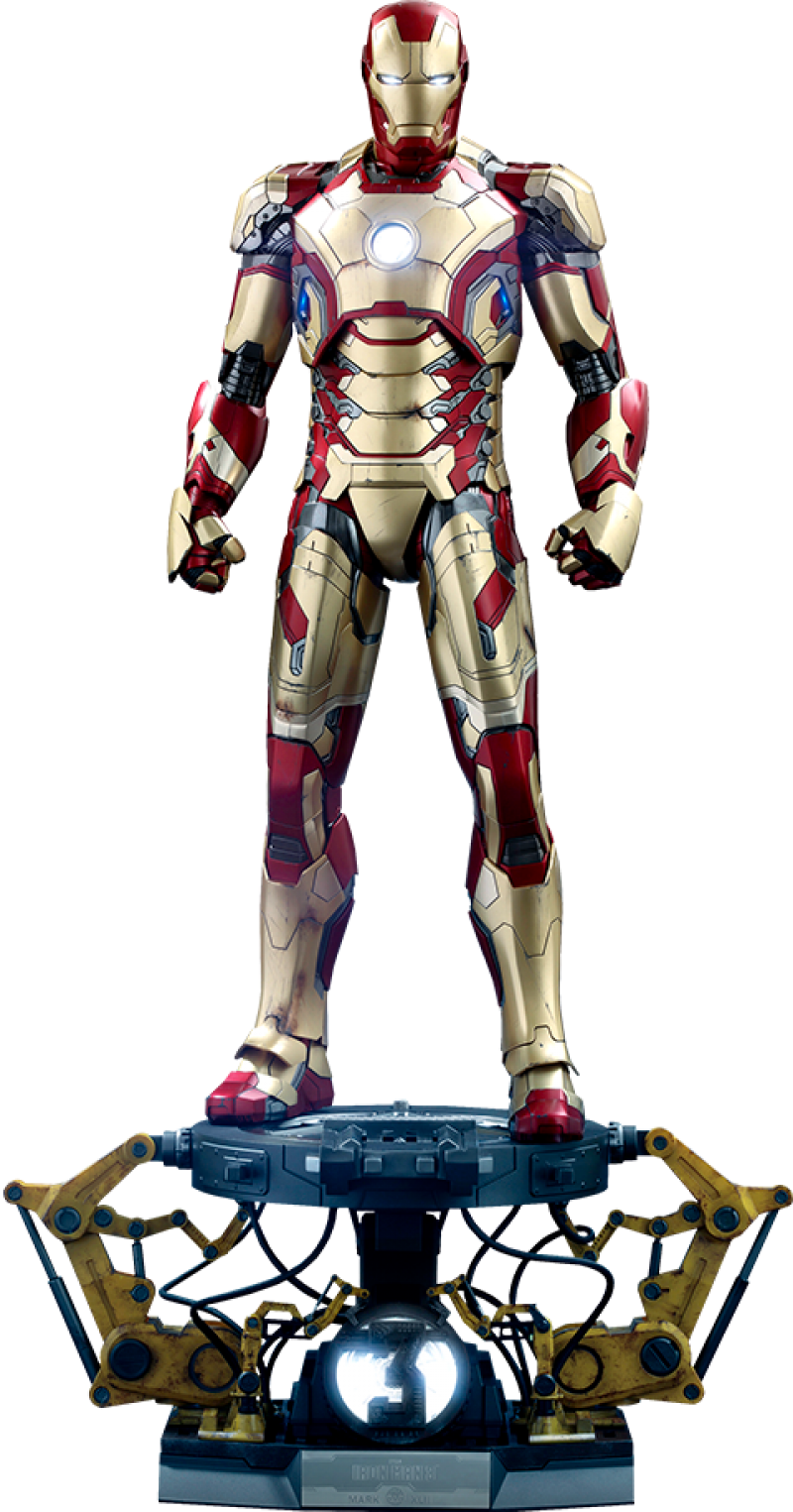 Meticulously crafted based on the image of Robert Downey Jr. as Tony Stark/Mark XLII in Iron Man 3, the movie-accurate 1:4 scale Mark XLII Collectible Figure stands approximately 49cm tall features a battle-damaged Tony Stark helmeted head sculpt and an interchangeable helmeted head with LED light-up function; specially applied metallic gold, red and silver colors on armor with weathering effects; a number of interchangeable battle damaged armor parts; a battery booster Tony Stark used to recharge the armor as seen in the film; LED light-up functions on eyes, arc reactor and repulsors, LED lights shine through various areas of armor.